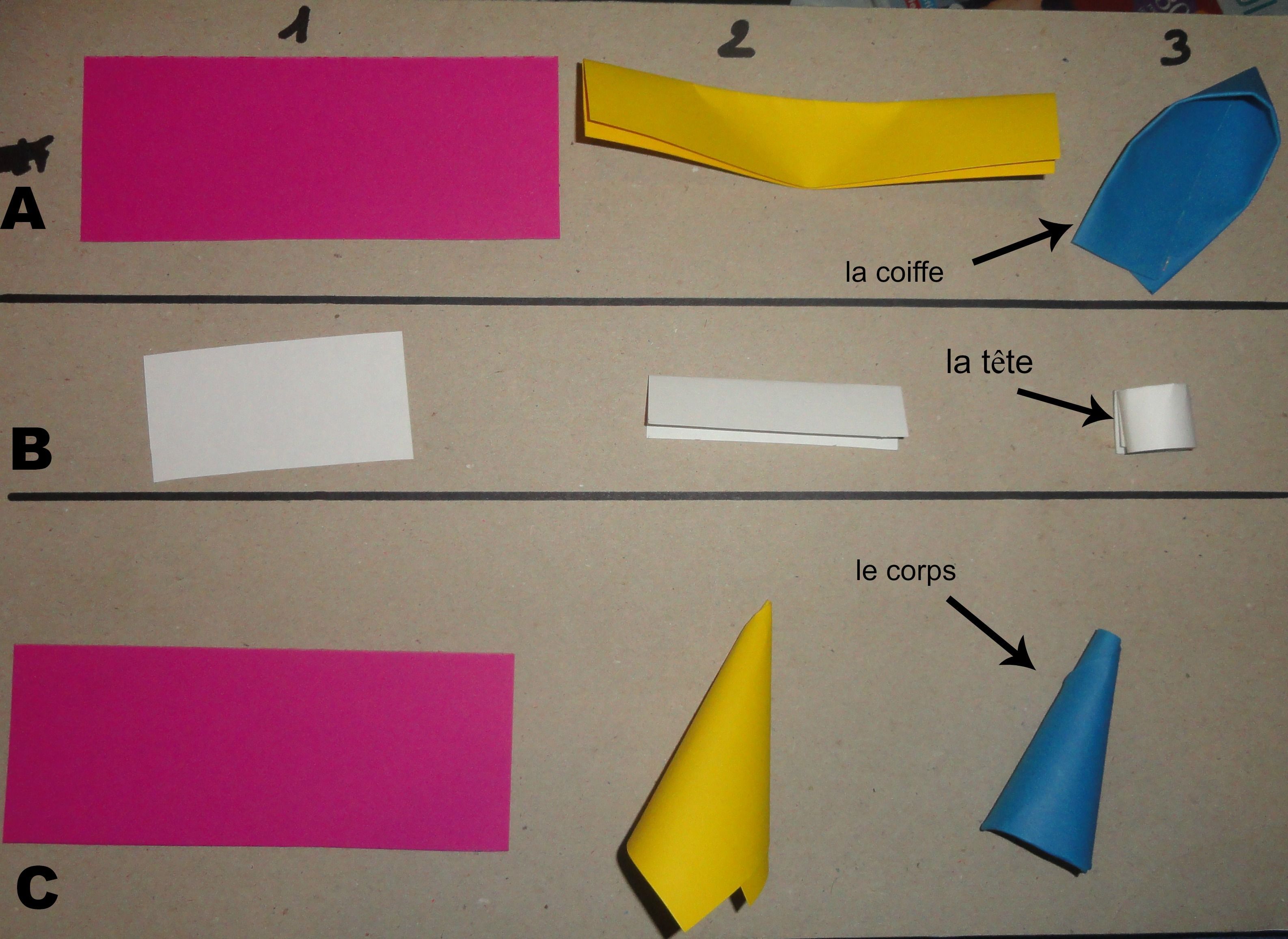 il ne vous reste plus qu'à assembler et coller le tout en fixant d'abord la tete dans la coiffe puis en inserant la pointe encollée du cône dans la tete
